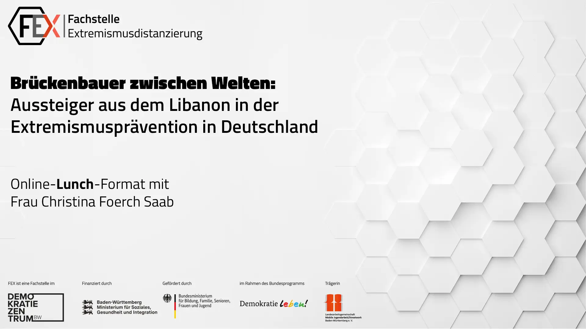 Wie erreicht man Jugendliche, die für Sozialarbeiter oder Lehrer kaum noch zugänglich sind? Manchmal braucht es jemanden, der den Abgrund selbst gesehen hat. In diesem Online-Lunch stellt Christina Förch, Mitbegründerin der NGO Fighters for Peace, einen in Deutschland noch wenig bekannten Ansatz vor: Die Einbindung ehemaliger Bürgerkriegskämpfer aus dem Libanon als Mentoren in die Präventionsarbeit.